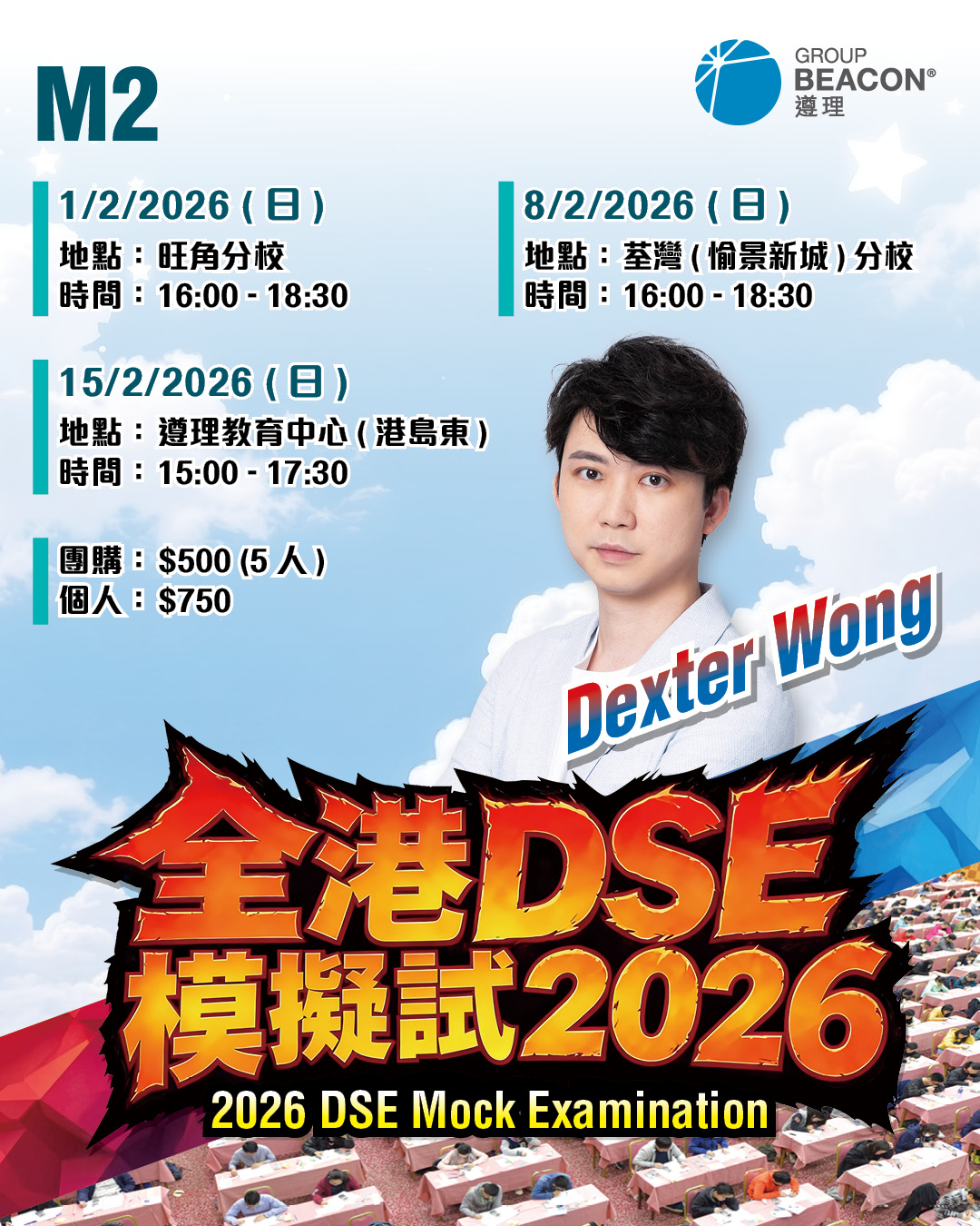 | 考試日期及地點 | 1/2/2026(日) 16:00 – 18:30 旺角分校, 8/2/2026(日) 16:00 – 18:30 荃灣(愉景新城)分校, 15/2/2026(日) 15:00 – 17:30 遵理教育中心(港島東) |