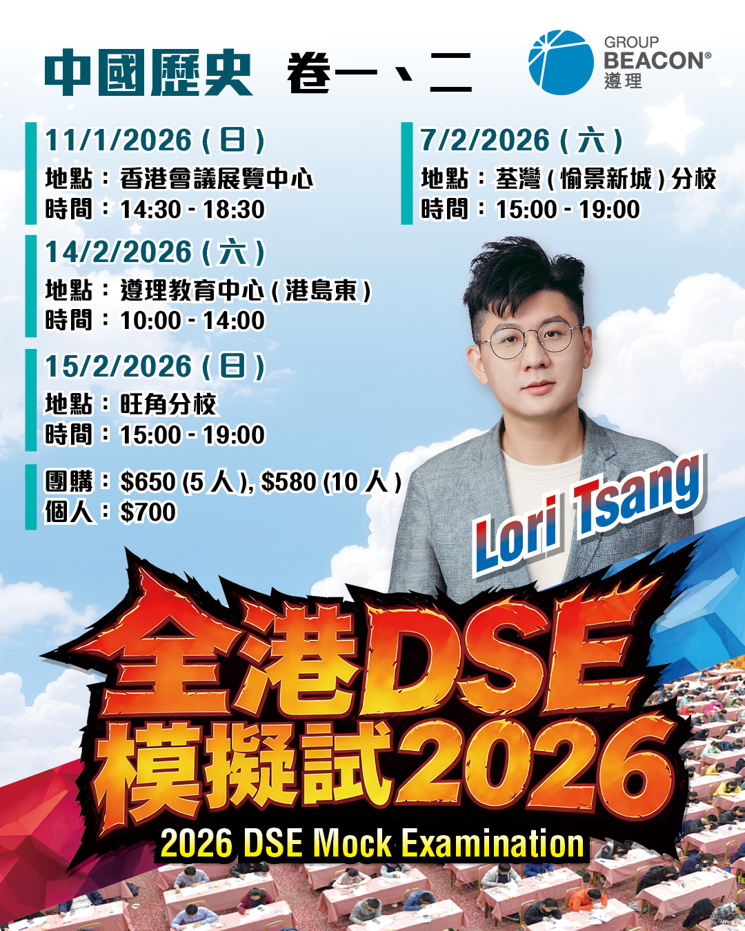 | 考試日期及地點 | 11/1/2026(日) 14:30 – 18:30 香港會議展覽中心S221, 7/2/2026(六) 15:00 – 19:00 荃灣(愉景新城)分校, 14/2/2026(六) 10:00 – 14:00 遵理教育中心(港島東), 15/2/2026(日) 15:00 – 19:00 旺角分校 |