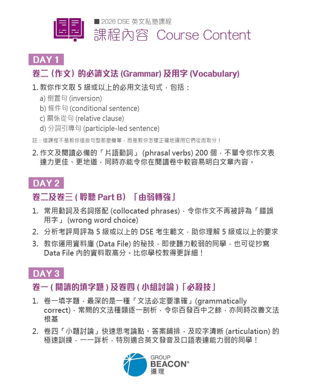 註:這課程不是教你這些句型那麼簡單,而是教你怎樣正確地運用它們從而取分!