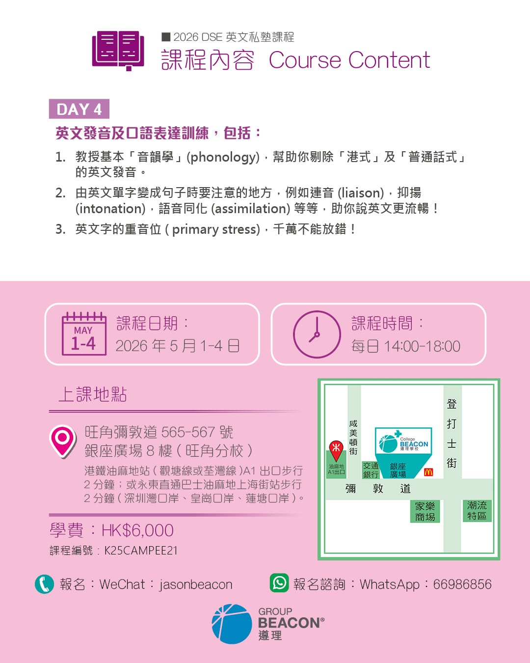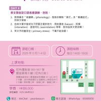 | 上課時間及地點 | 2026年5月1-4日 / 每日 14:00-18:00 / 旺角彌敦道565-567號 銀座廣場8樓(旺角分校) |